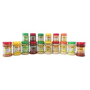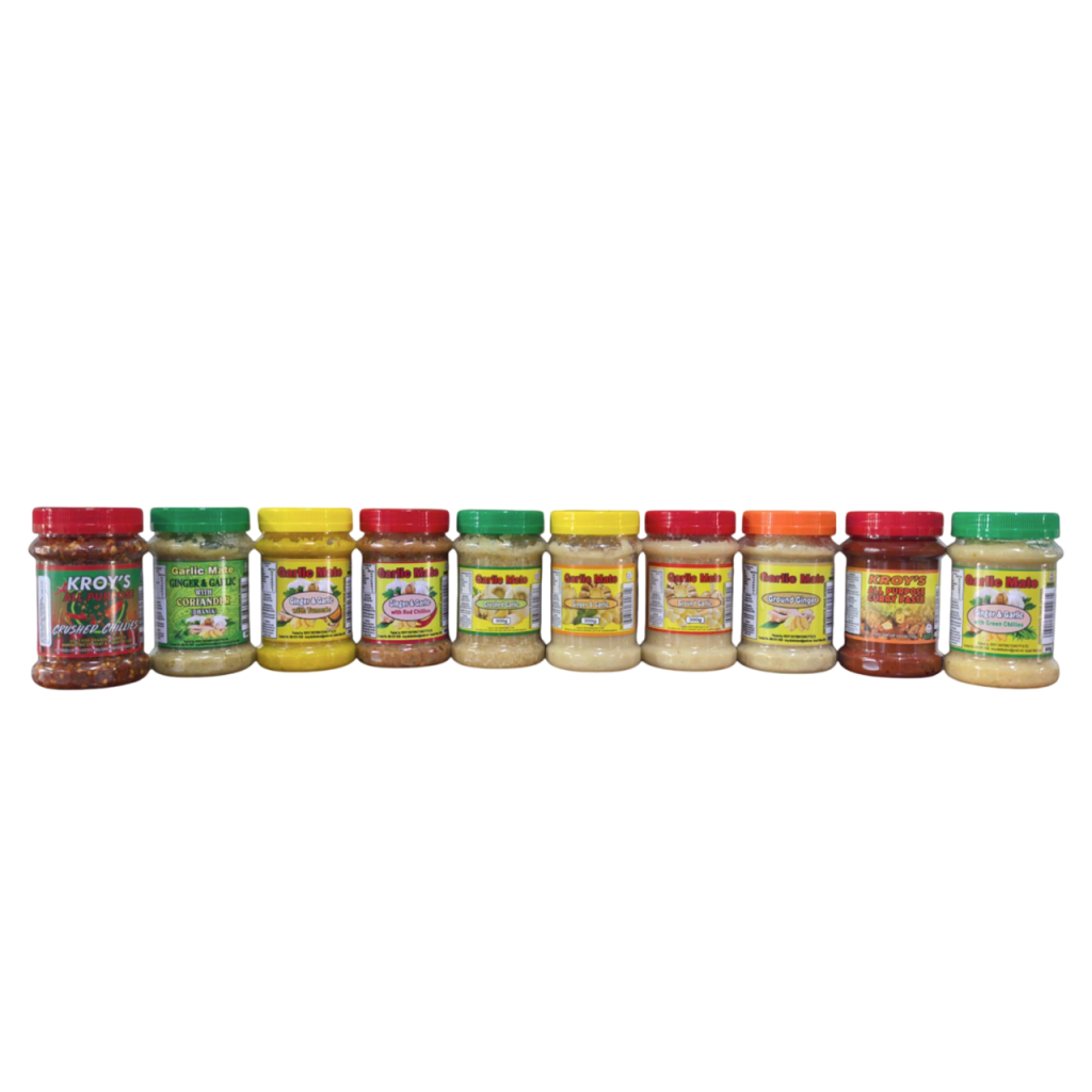 Atchar Range: Available in Mild, Garlic, and Spicy flavours — sizes from 90ml to 20kg for personal and commercial use.